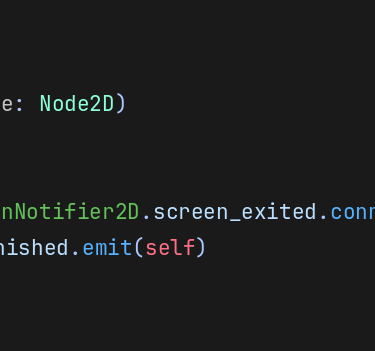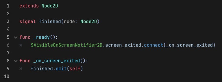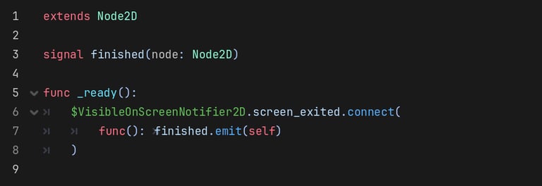 A lambda function is just like a normal named function in every way, except that it doesn't have a name. Instead, you define the function where you would otherwise call a function by name. Consider the example below, where we connect the screen_exited signal of a VisibleOnScreenNotifier's to a function that emits our own finished signal. We cannot connect screen_exited directly to the finished signal because finished requires an argument which we need to explicitly pass.