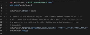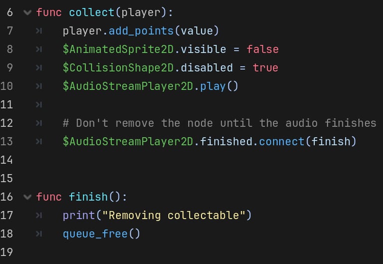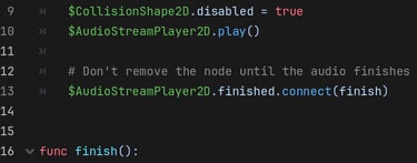Up until this point, we have been able to react to things immediately when they happen. When the player pressed the "jump" key, we can make the player jump. When the player collides with a wall, we immediately stop moving and change the animation that is playing. But sound effects can create a situation where you need to wait until the audio finishes playing before doing the next things. For example, when the player picks up an items, you will probably want to immediately remove the item and play a sound effect. The problem is that if the AudioStreamPlayer2D node is a child of the item, then it will be destroyed when the item is removed, and thus the audio stops playing (or doesn't play at all).