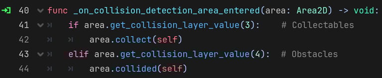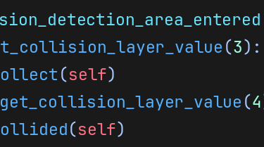 In this new function, check if the area's collision layer is 3 (Collectables). If so, call area.collect(self) to collect it.