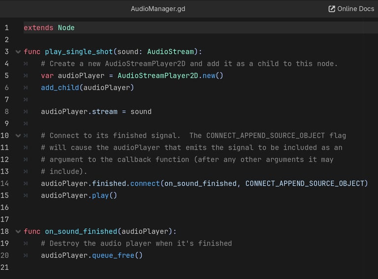 Another way to workaround this would be to have some sort of global audio manager class that can play sound effects for any node in the scene so that the AudioStreamPlayer2D node doesn't belong to the node that is getting destroyed. This is called a single shot sound effect, because the audio manager class would create a new AudioStreamPlayer2D node on the fly, add it to the scene, assign the audio stream to play (likely passed in to a function that triggers the sound effect), and then destroy the AudioStreamPlayer2D node after the audio stream finishes playing. Thus, it only exists for a single "shot", or a single sound effect. Now, any node in the scene can play a single shot sound effect without having to manage its own AudioStreamPlayer2D node, and it can immediately be destroyed after triggering the single shot sound effect!